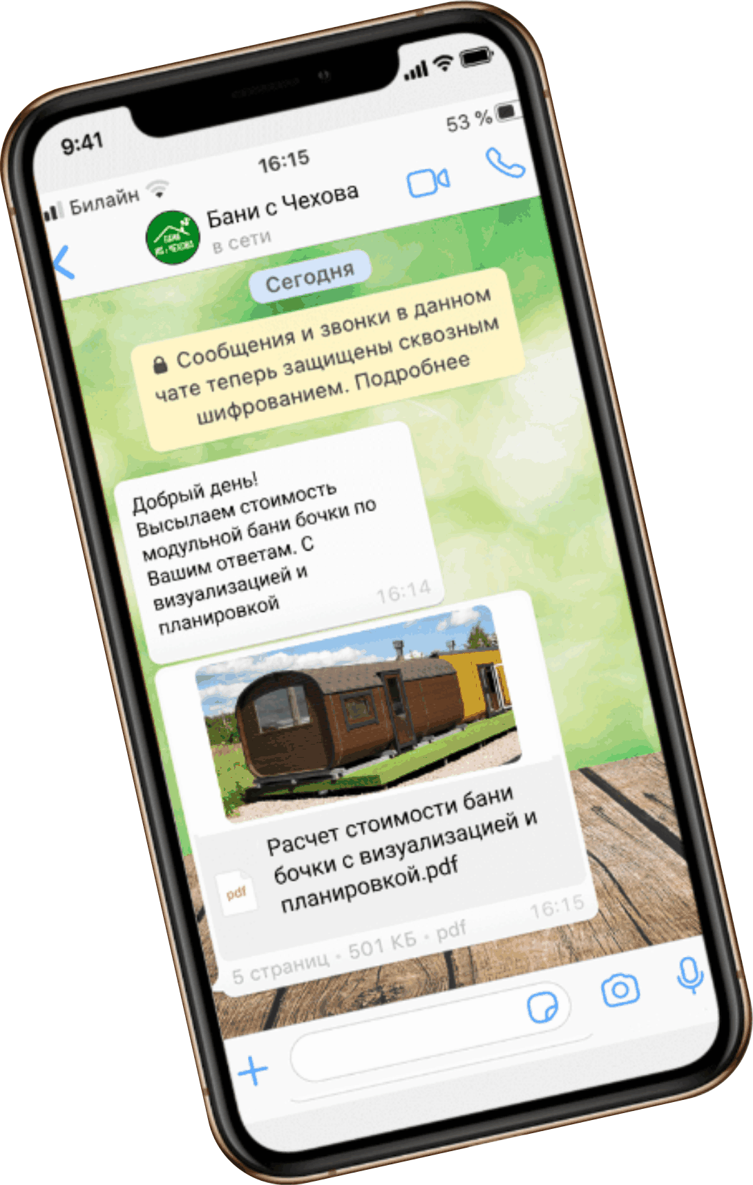 Оставьте номер телефона или мессенджера - Вы получите точный расчёт бани, консультацию по комплектации и срокам монтажа